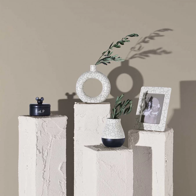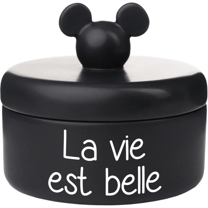 Ornée d’une poignée en forme de tête de Mickey, cette boîte de rangement noire de 12 x 11 cm offre un espace de rangement suffisant pour les bijoux, bibelots, clefs ou autres petits objets.