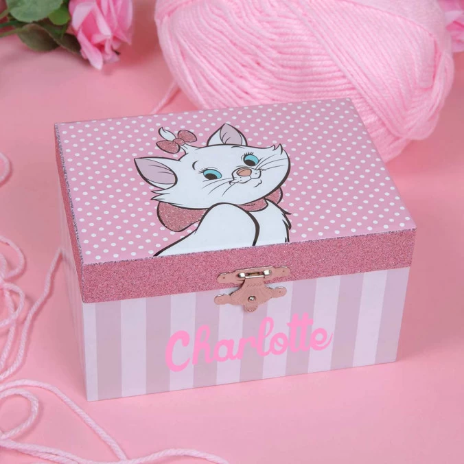 Votre fille aime les chats et les bijoux ? Offrez-lui cette jolie boîte à bijoux musicale à l’effigie de Marie des Aristochats, personnalisée à son prénom.