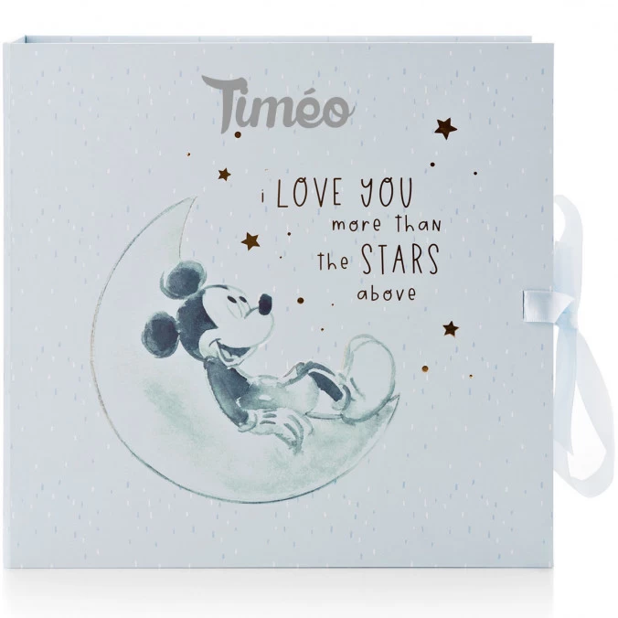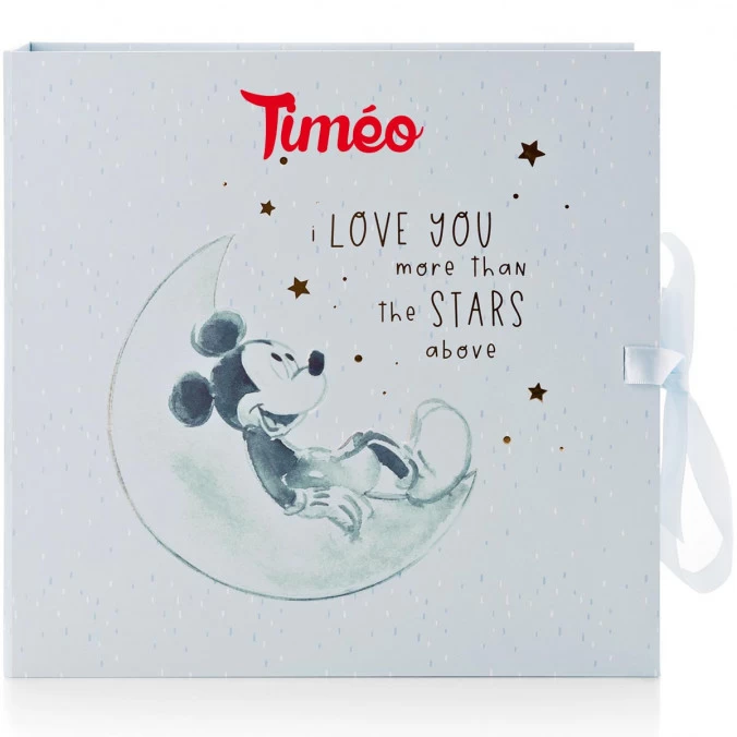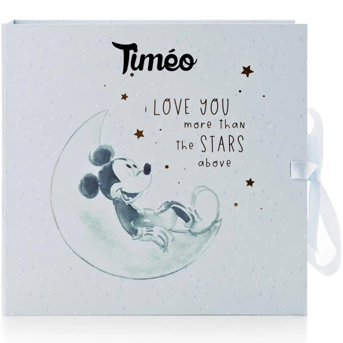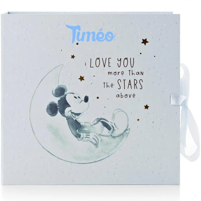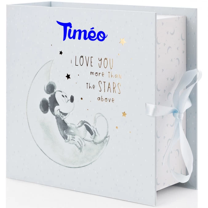 Des tons doux de bleu, une illustration au design sobre et élégant de Mickey, accompagnée d’un message discret doré «I love you more than the stars above*», cette boîte est un véritable objet de décoration.