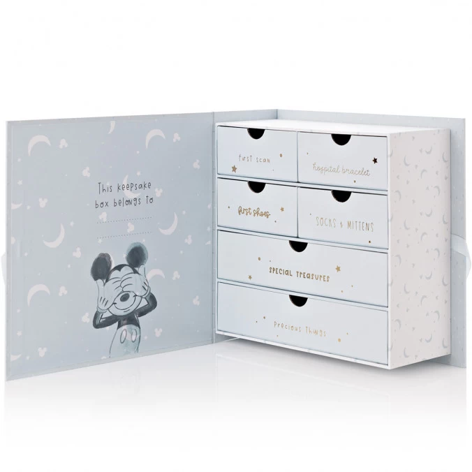 Cette boîte à souvenirs à l’effigie de Mickey, la célèbre petite souris de Disney, est personnalisée gratuitement au prénom de votre bébé.