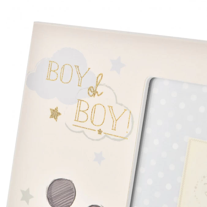 Des tons doux, une illustration au design sobre et élégant de Mickey, accompagné d’un message discret doré à paillettes «Boy oh boy», ce cadre personnalisé à pied pourra se poser sur toutes les étagères de la maison.