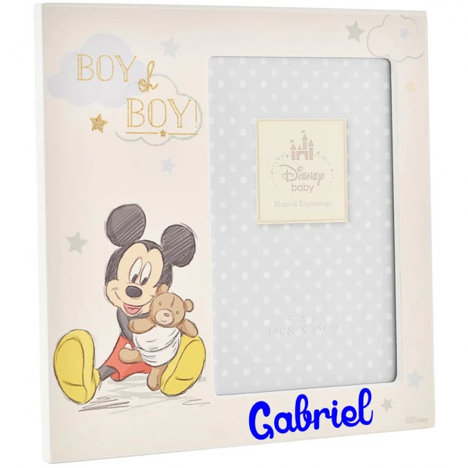 Ce cadre photo à l’effigie de Mickey, la célèbre petite souris de Disney, est personnalisé gratuitement au prénom de votre enfant.