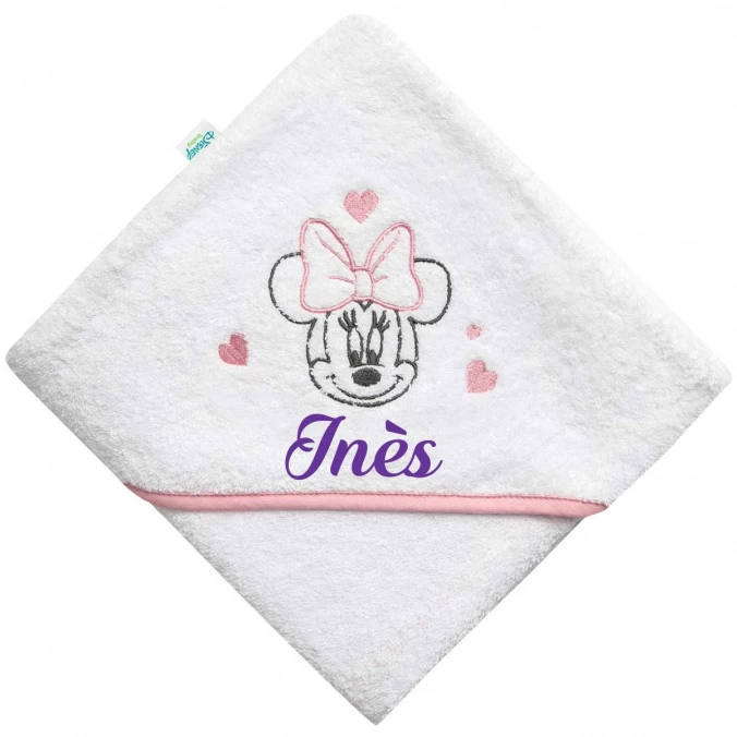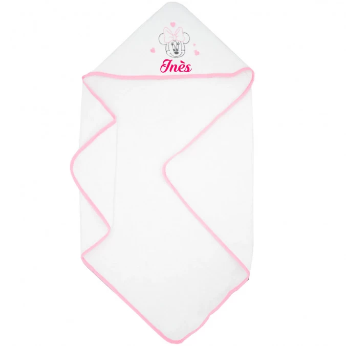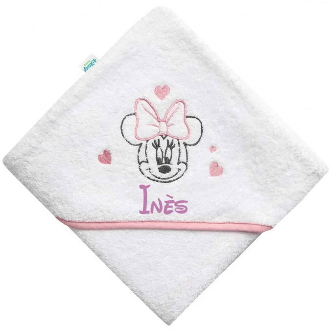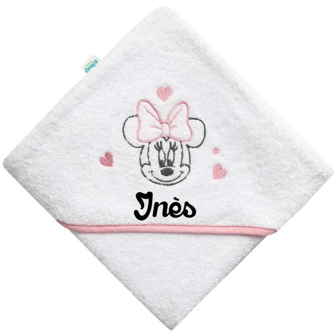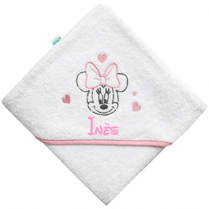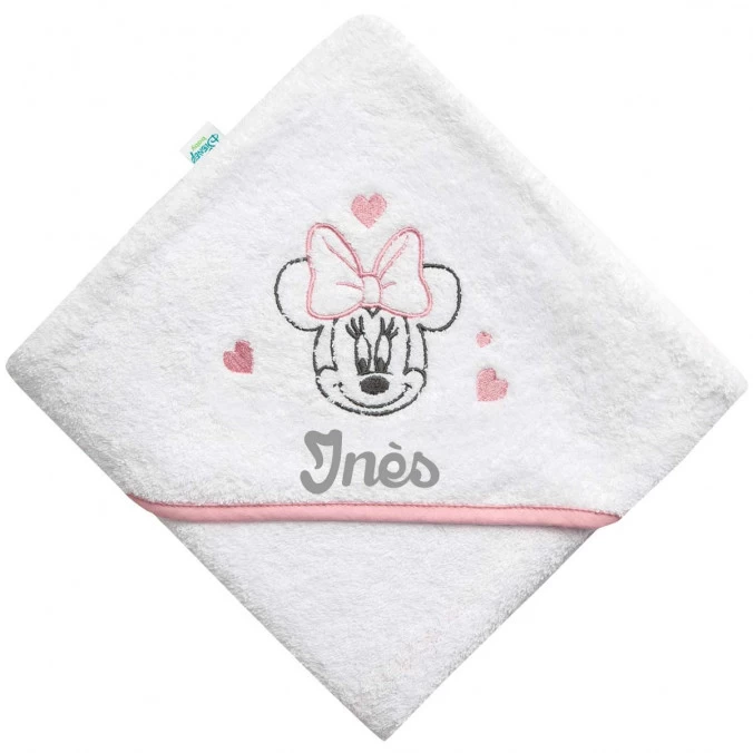 À l’effigie de Minnie entourée de cœurs, cette cape de bain aux tons blanc, rose et gris est personnalisée gratuitement au prénom de votre bébé par broderie.