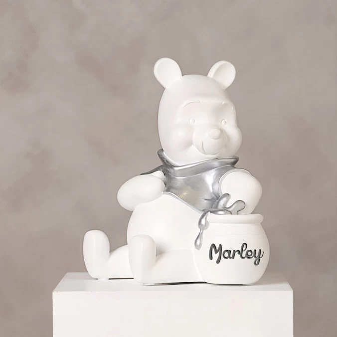 Véritable objet de décoration, cette tirelire à l’effigie de Winnie l’Ourson, le célèbre personnage de Disney, est personnalisée gratuitement au prénom de votre choix.